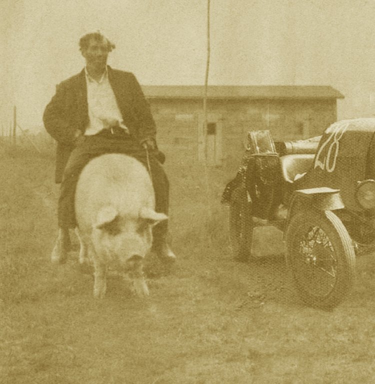 In his day, Rembert was a fierce competitor. He especially liked to challenge the early motorcycle riders in the "teens". Rembert won most of his races on wet, muddy roads that totally bogged down his wheeled competitors, giving rise to the oft-repeated phrase, "happy as a pig in mud".