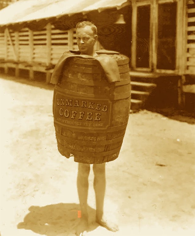 I see that the three fellows hitchhiking have barrels with no labels also. Had they the foresight to label their barrels, they might have better results as did Rudolph Bratencaster, shown here.