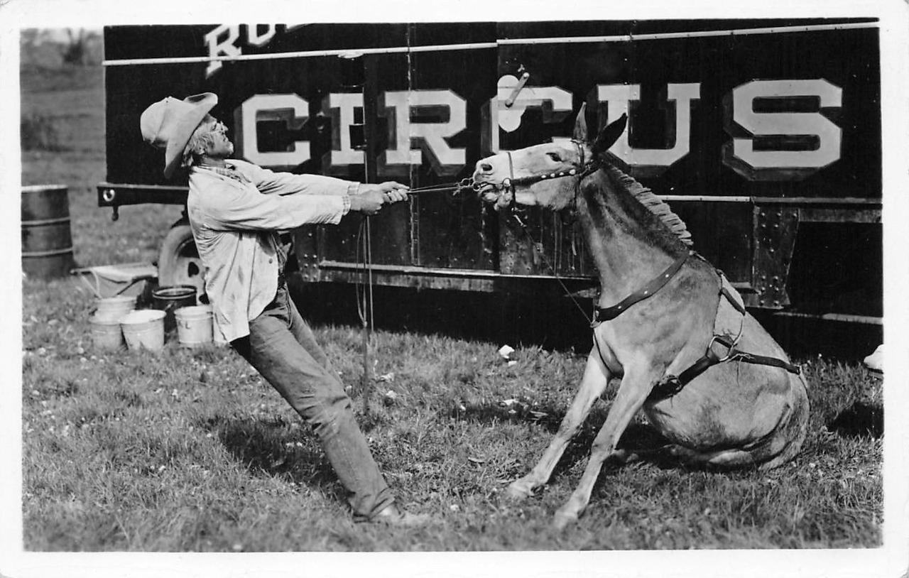 That is a remarkable picture I never expected to see ! Doubtless, that's Cuthbert's nephew twice removed, Ethelbert Maddox. He was first removed from the Flying Diamond Ranch for ducking work. On roundups, he'd circle back to town, and hole up in Ernie's Saloon until the herd was trailed down Main Street toward the stockyard pens. Then he'd slip in behind the last "drag" rider (no off-color comments, please) and pretend he'd been punching up the strays. After the foreman fired him, Ernie had to remove him from the saloon. When the Wrangling Bros. Circus came to town, Ethelbert hired on, convincing the ringmaster that he had a unique animal act. He borrowed Cuthbert's talented zebra dun mule, as he knew how Cuthbert had trained the mule to do many useful and amusing tricks. Problem was (amply illustrated by this photo) Ethelbert knew nothing about handling equines, much less the Zebra Dun, who personally disliked Ethelbert anyway. By the time of this photo, the unique hash-marks above the mule's fetlocks had faded away with age. The Zebra Dun had stage-fright and would have hated circus life anyway.