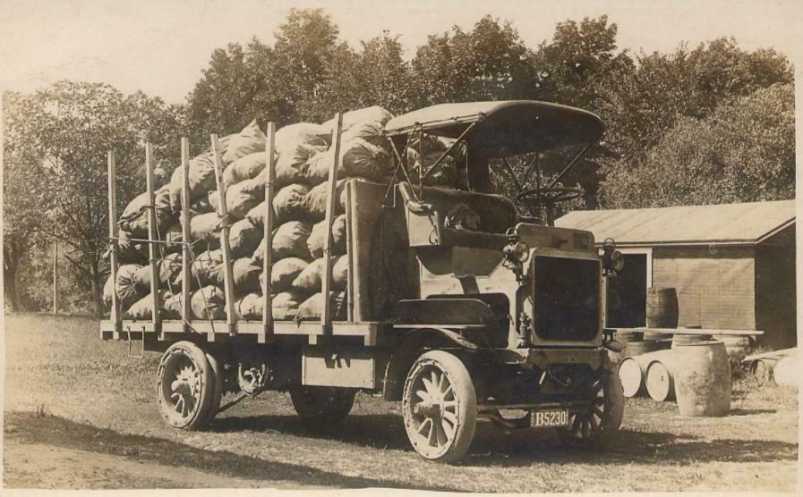 Thanks Rich. I'm learning some from the identifications on this forum, thanks largely to you ! The driver is bundled up, so it's cold weather. One form above the sideboard looks like a pumpkin, but I can't really tell. I find the loads being hauled in these old photos almost as interesting as the trucks themselves !