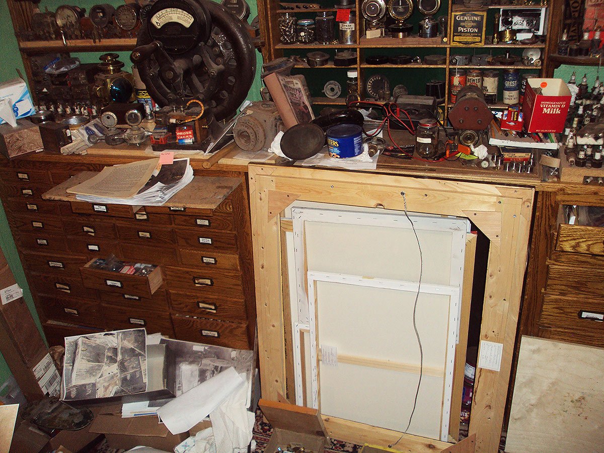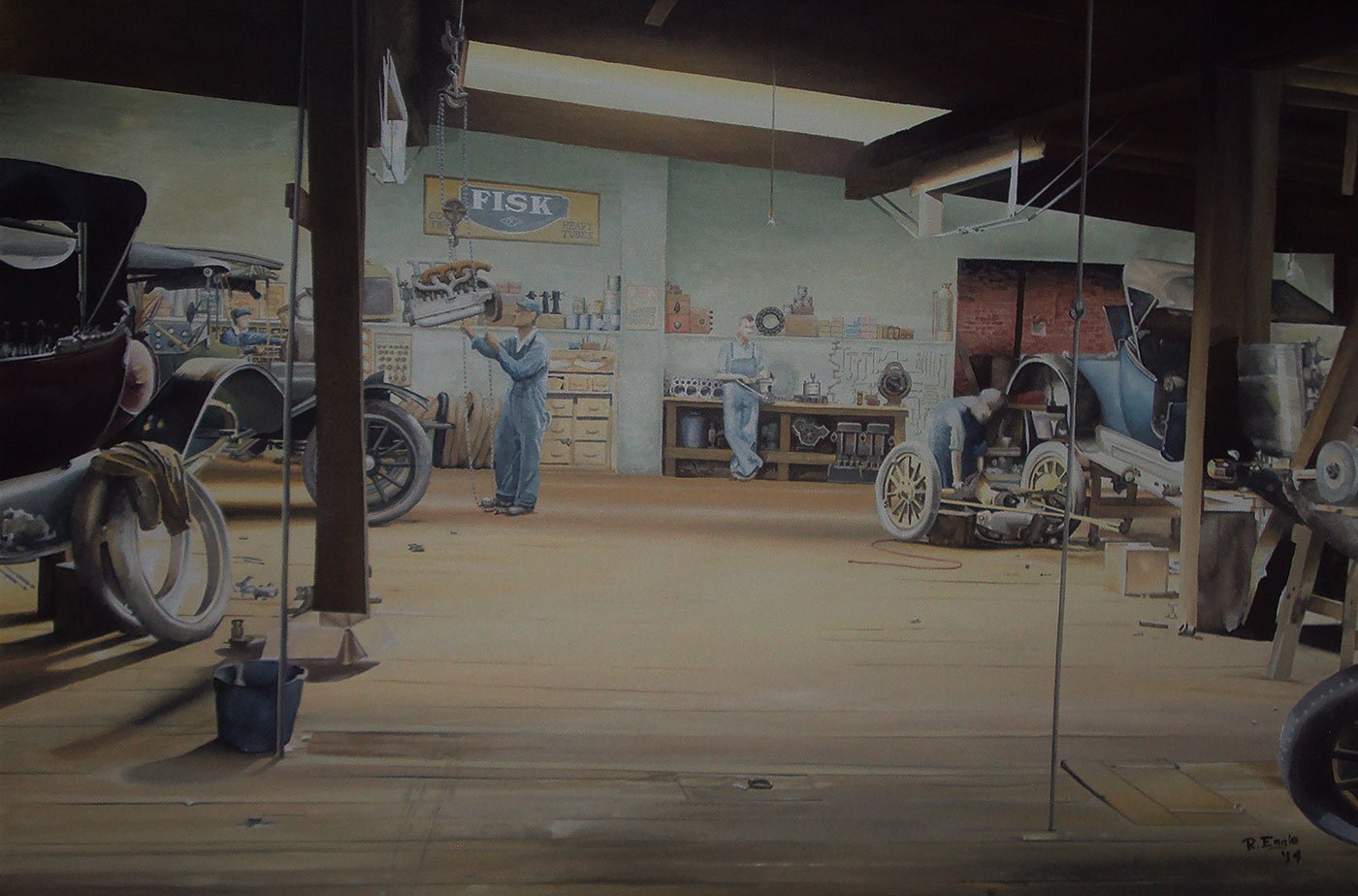 I painted this in 2005 of a Buick repair shop. I had recently purchased a 1907 Model G Buick and was reviewing photos for it.