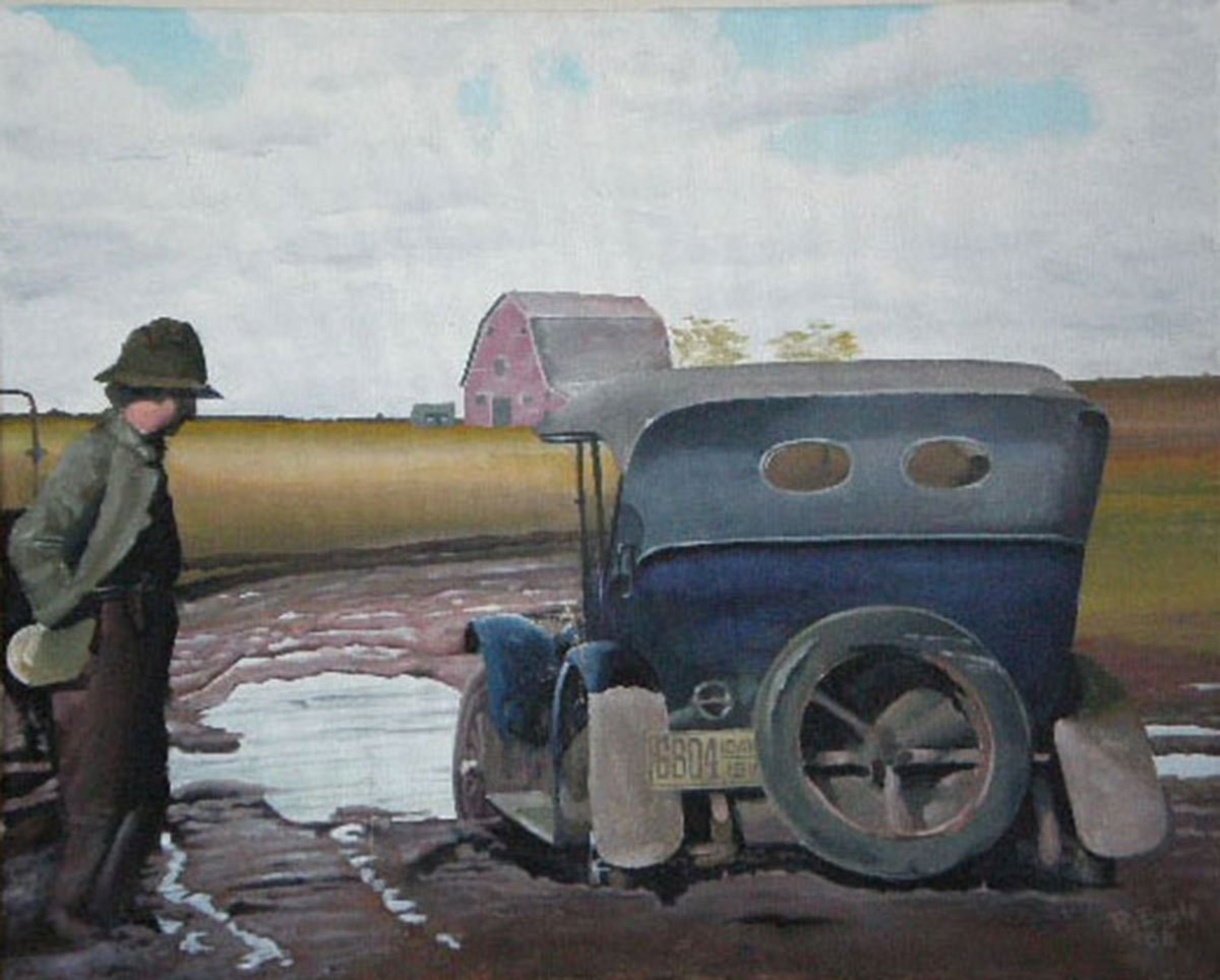 This one was painted from an old photograph from a family album. Dad probably took it in Bozeman or Helena Montana. An "old car" in the late 20s or 30s is a novel idea. I'm guessing the car was a Mitchell.