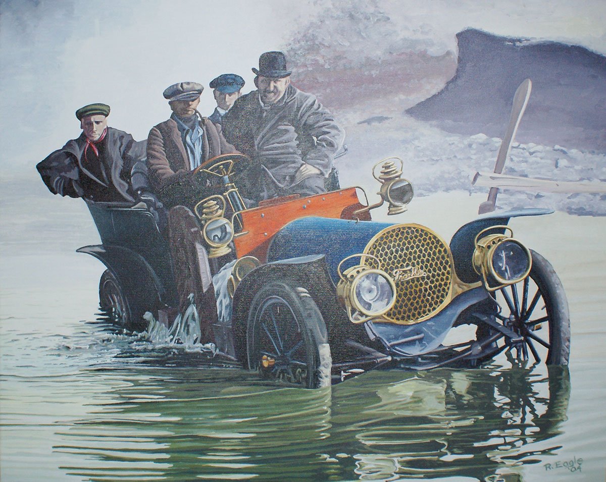 This Franklin was painted from a black and white photo. It might have been demonstrating the car could keep running in a stream. Apparently the flywheel is churning water through the floorboards.