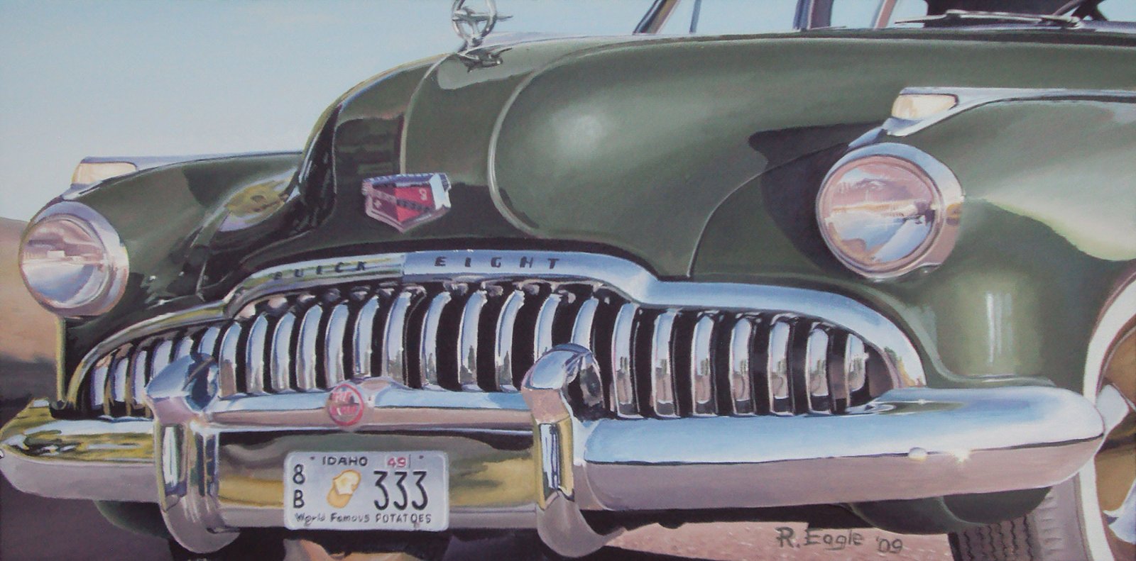 This is a fresh one. It is another study of textures and color. It is on black canvas which is my first try at that. It seemed well suited for the dark corners of the cockpit of this Packard. I assume it has a Twin Six engine.