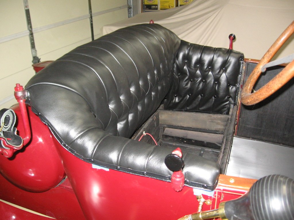 I received the new upholstery kit for the Flanders yesterday from Classtique, they used my originals as patterns. They were very generous with extra material and padding so that the pleats will come out fully packed with padding. They used a mix of leather and vinyl to match the original materials. They also included extra material so that I can make new door and footwell panels to match if desired. In the pictures, the seat back is on the floor and the seat base with its extra padding and canvas is on the couch, still wrapped in plastic.