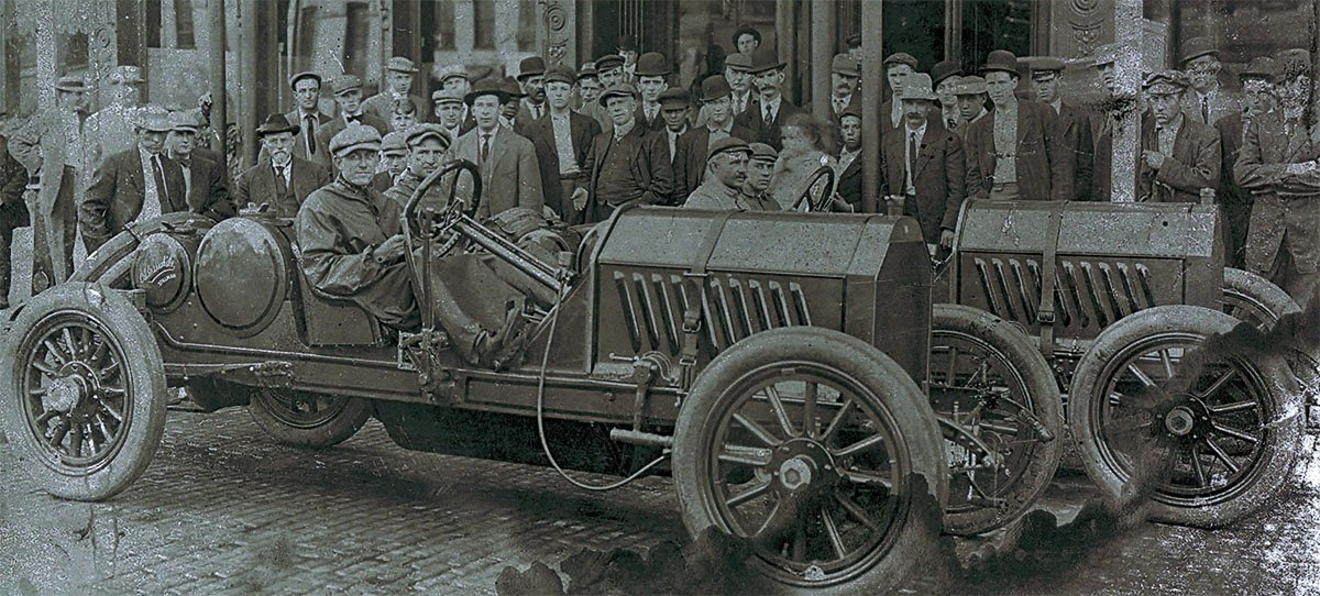 It's a great photo Herb. I can't find anything about that car. Here are the two Oldsmobile entrants to the 1910 Vanderbilt cup Race. I see that the rear spring mount, the hand levers and the steering arm all closely match the car in question. The few engine pictures I looked at don't have the same manifold arrangements. Perhaps it was an experimental design.