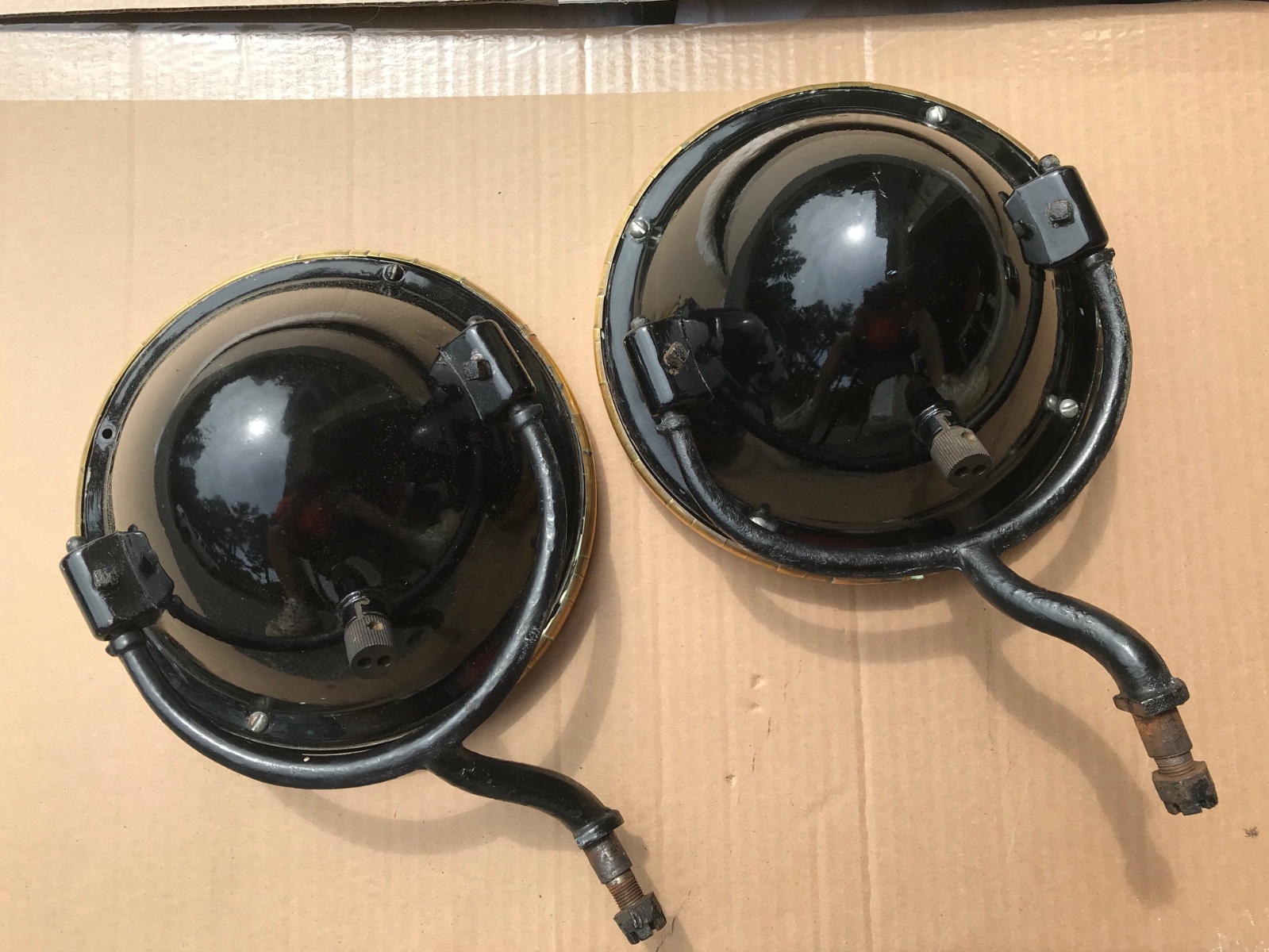 I have a pair of double bulb headlights. The buckets are the same in shape as these above but were designed to attach to the fender bracket like not forks. Also no screws on the backside of the rim of the bucket. Looking at the entire setup makes me think they were made by someone for their car. Would be easy to tell more to see how the headlight rims are holding the lens in place. Also how the brackets on the bucket for the forks are attached (rivets?). Take some pictures of the the back side of the headlight ring and the inside of the bucket to see what behind the reflector