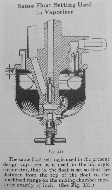 A friend of mine has a compliant with his 1927 roadster. It will start and run at low speed, but will 'run out of gas' at more than an idle. This engine uses a Holley vaporizer carburetor. I have very little experience with the vaporizer. I have read a little about them and it seems that the heater plate is a major problem. Yet after cleaning the carb, I find that someone must have installed some new parts in this carb recently. The heater plate seems fine. I cleaned it up and did not find any corrosion or cracks. I flexed the plate and could not detect any problem with the plate. I do see some black carbon on the fuel side of the heater plate. There are or were no gaskets on either side of the heater plate. Should there be? The exhaust manifold was leaking badly and I suspect that this may have been the source of this fuel side carbon. I believe the heater plate fuel side was not sealed and allowed exhaust gas into the fuel side of the heater. I believe the main problem with this carb is that the float level is way to low. I think it should be 3/16 to 1/4". I found it closer to 1/2". I want to clean everything up, reset the float level, check the float needle for seal and try this carb again.