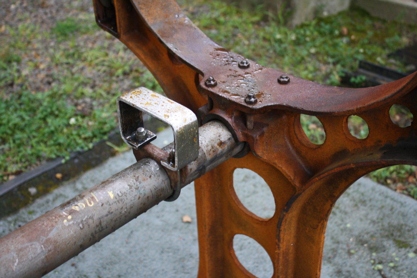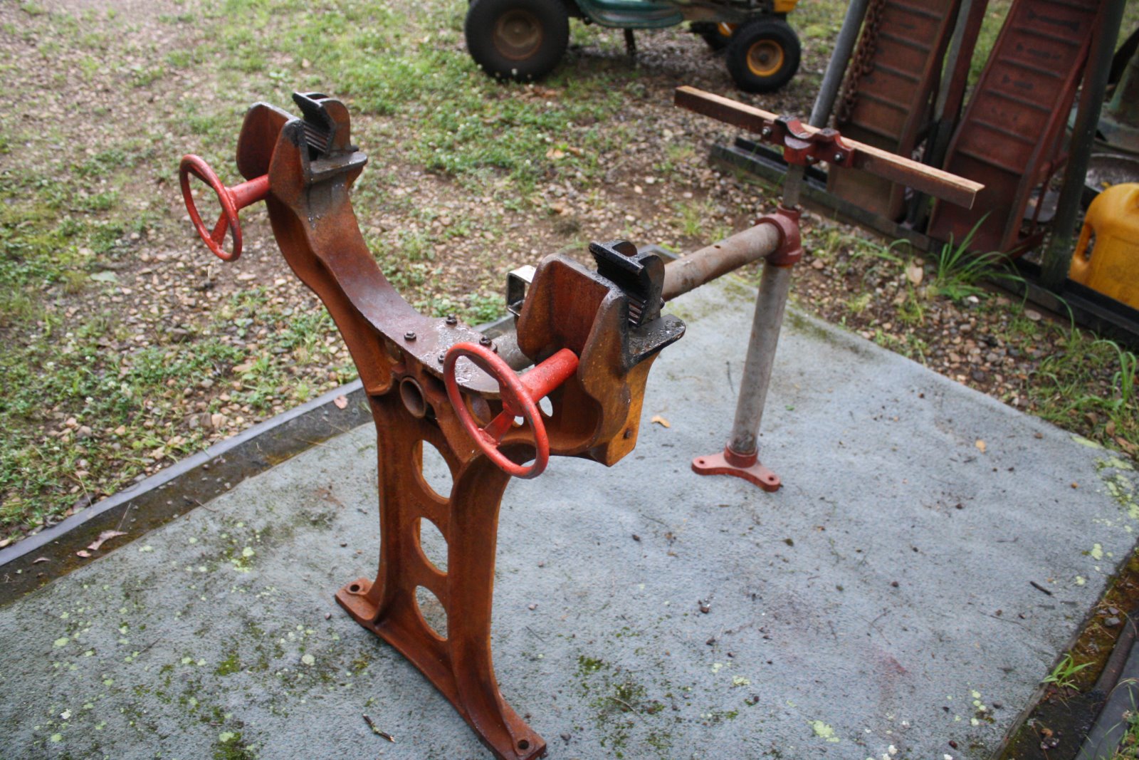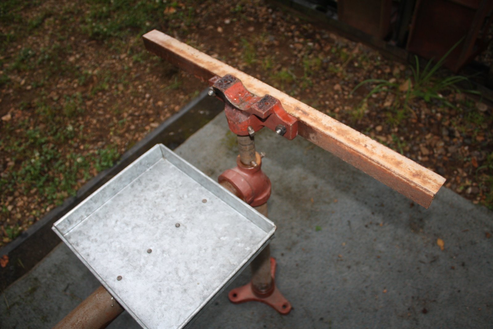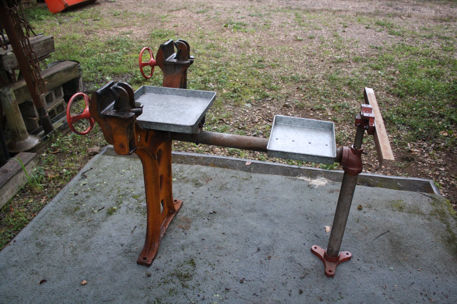 I received a new tool for the shop a few days ago. It is a tool I purchased before Chickasha that was going to be delivered to the swap meet. Well we know how that turned out. Thanks to three very good Model T folks, the stand has made it from Colorado, to Tulsa, then on to Dardanelle Arkansas and then on to me. Thanks so much to Nick, Mike, and Bill. I have always wanted a rear axle / front axle rebuild stand. There are other makes of stands that are more efficient, or just work better than the KR Wilson stand, but Im very happy to have this one. Ill restore it this fall when it cools off a little and running the sand blaster will not kill me.... There is really very little to do except to sand blast and paint. The hand wheels have been broken and repaired with incorrect shaped parts. I may have some new hand wheels and spokes water blasted from plate to match the originals. The center part of the current wheels is the original part. I just need the wheels and spokes.