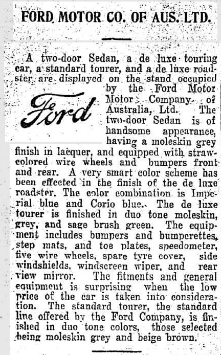 on 13th May 1926 ( 2 months before the July 1926 Detroit introduction) ) Ford Australia announced that their factories were now complete and the Ford would be finished in Lacquer in three optional colors, Imperial Blue, Empire Grey, and sage Brush Green.
