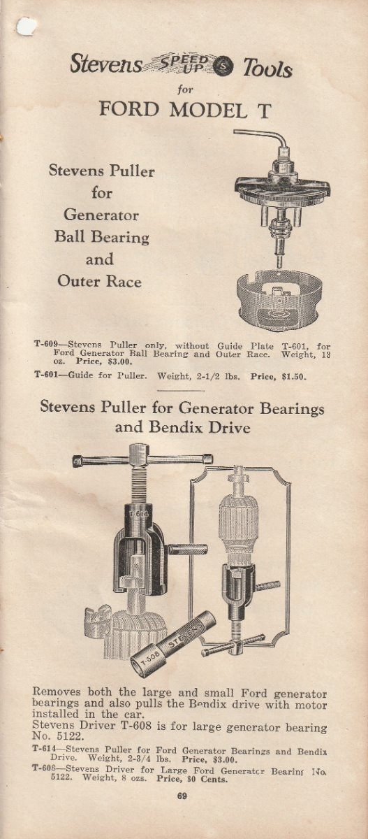 I finally acquired another Stevens catalog. They are very hard to find, and even harder to find one that is for sale. . It is what most folks consider the 1928 version. Stevens was bought out by Walden Worcester in late 1926. This is the catalog they put out after the buy out. It has most all the Stevens tools that were in the earlier catalog I re-printed several months ago,, and several tools that are in no other catalog that I know of. Most of them I have never seen in print before. I will post a few pic of some of the different tools. But I can not show all of them here. This catalog also has the Walden Worcester line of tools. Walden tools were not near the useable quality of the Stevens tools. Walden really stepped up their game when they acquired Stevens. Even though the Walden tools are not really as useful to us today, they are very collectable. This catalog will show what each Walden tool number is used for. There is also a small section of tools for the new Model A that just came out. There are a few pages of tools for Dodge, Chevy, Buick ect. It appears that Walden/Stevens was trying to widen their market in 1928. There is not much of the "other makes" tools. Most of the catalog will apply to our Model Ts. A lot of the Walden tools were considered to be useable on most all cars and trucks, so they are shown as "standard" tools even though they are some of the the same tools shown in the Model T section. This catalog is a very good reference for taking to a swap meet. The catalog is about 4 by 8-1/2 inch and has 96 pages not counting the covers.
