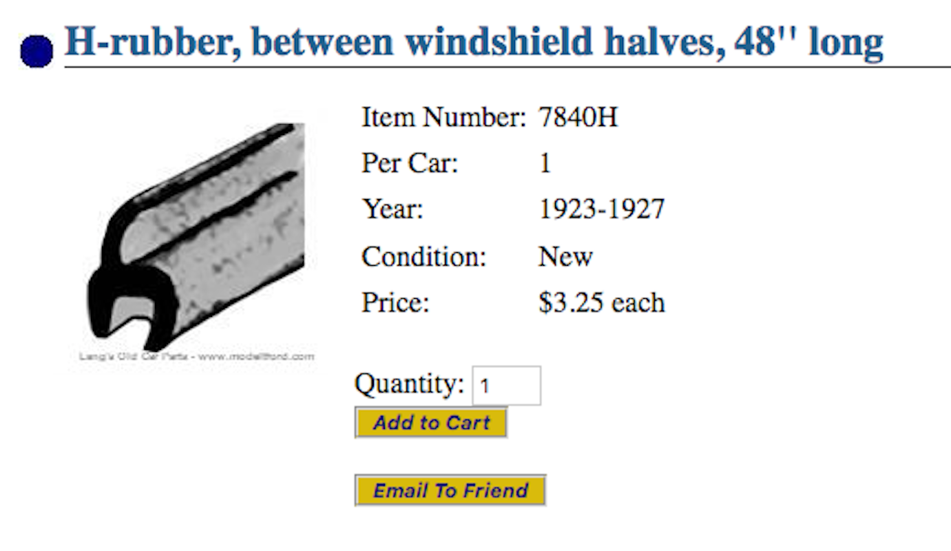 OK here is my take on it. I have never seen the factory drawing for the "h" rubber but the item I purchased many years ago that was sold to me as the correct item for between my 2 w/s halves of my '23 Touring simply could never work on my car. I checked others and so far as I know I have never seen anyone that has the item "installed correctly" but I suspect if it fits it will have to have a lot of rubber removed and I don't see how that can be done very accurately since a Stanley knife is about all that could be used. I keep a roll of duck tape under my back seat and if it really starts to pour I simply put a piece of duck tape across the windshield from far left to far right and that moves the water to either side and gets either my left sleeve soaked or my wife's right sleeve. I wonder if anybody has the actual Ford "Factory" number for that rubber piece or if anyone has an actual Ford print for that factory number.