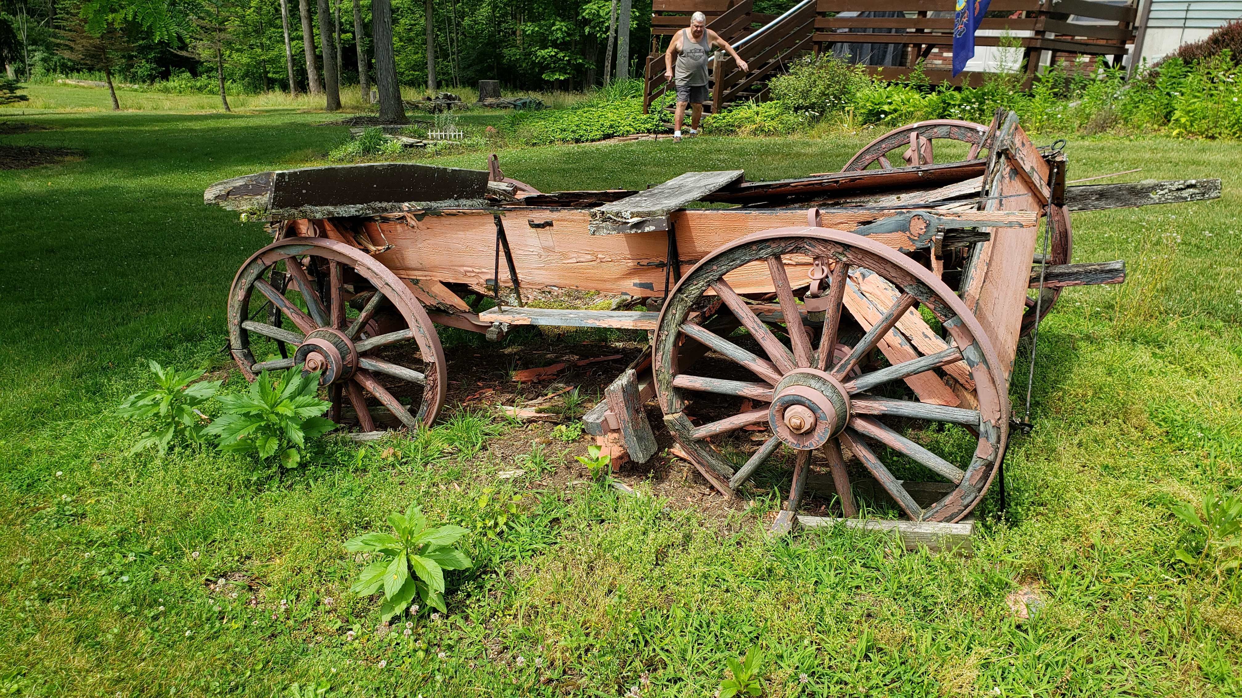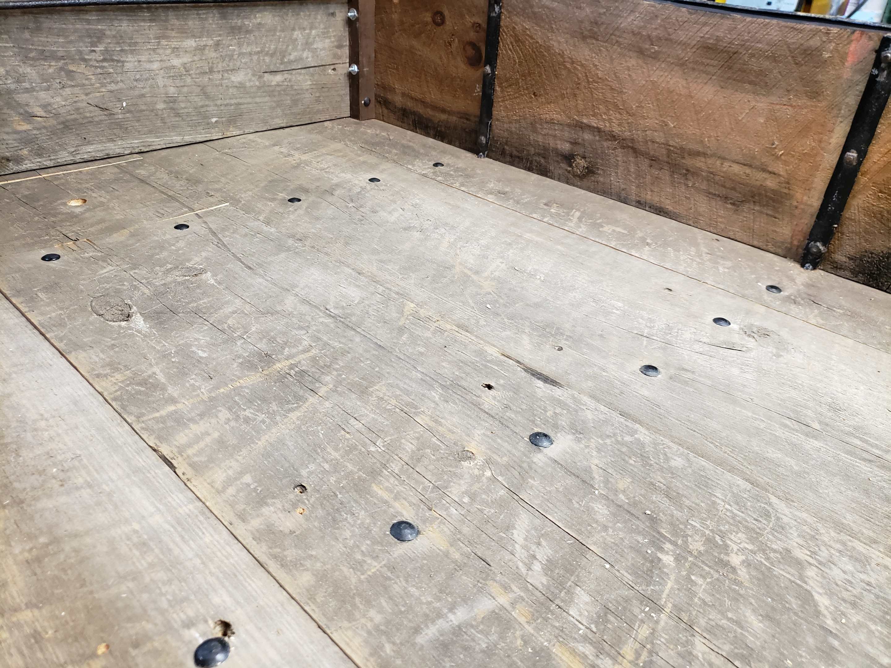 All planks are rough-sawn Hemlock cut on an old Frick sawmill and weathered from their previous use as a wagon bed. The subframe is 'new' spruce from the lumber yard. The bigger brackets and hardware is hand forged from an old wagon and the new carriage bolt heads get the new style production marks ground off and then painted black before installation using new 'squares nuts. We are trying hard to make this creation look old.. or at least close enough to fool most people!