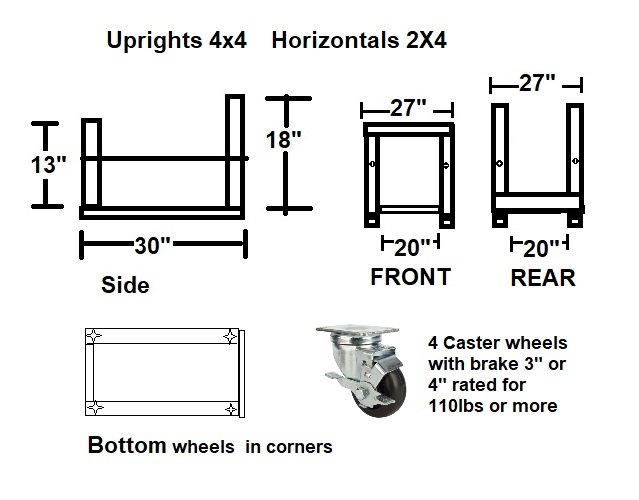 Made it simple (no angle cuts) 4x4, 2x4 1x4. Carriage bolts, lag bolts use any diameter threaded rod its just to steady the posts while the engine is dropped in place. Most expensive part are the caster wheels - I was going to buy a dolly and use the wheels but didn't like the quality, up to you. Harbor Freight Dollies are 30"x18" so you can use it for the base by making it wider. Wheel decision should be based on the evenness of your floor, 4" turns easier than 3", 4 swivel more maneuverable than 2 swivel on one end and 2 straight on the other