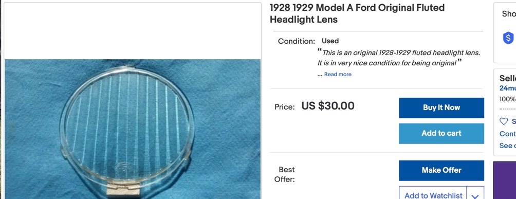 That listing for "Rare Model T lens" is wrong. That lens is the early Model A fluted version, lots around, this listing is on eBay now with a price that is more in line with the part. The seller is just looking for that casual sucker to come along, trolling for a quick bite on someone's wallet!