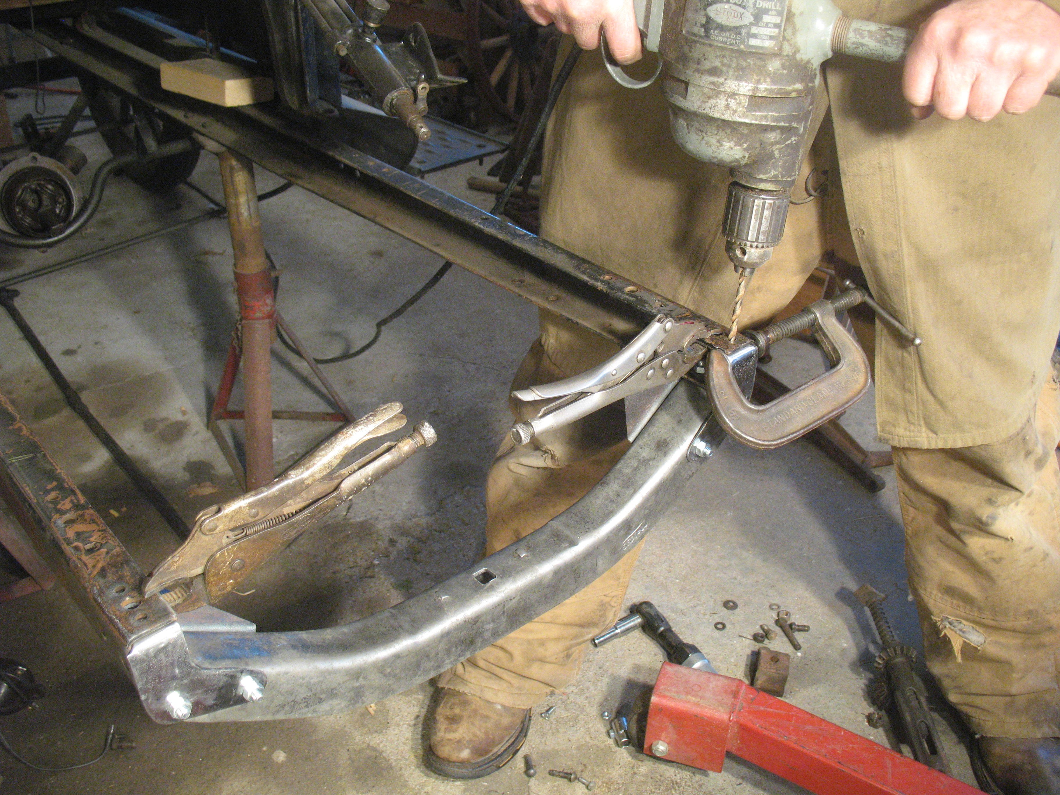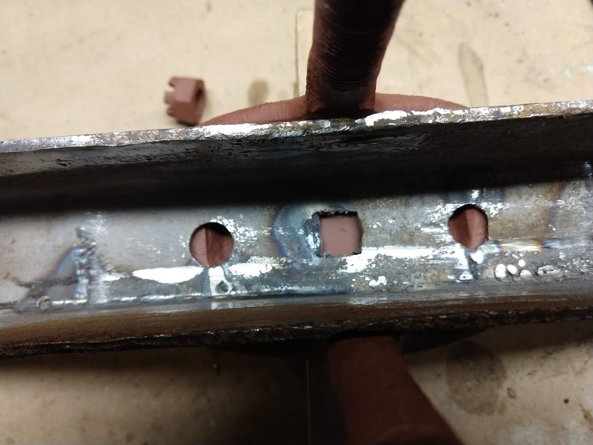 Hi Steve. That's what I'm planning on doing. Welding shut the two holes and adding bumps/nubs where they will keep the cross member from shifting. Apparently this cross member did shift. So much that the square bolt hole was only square on three sides. The bolt is a round head bolt; maybe from being slid around a bit. Or maybe they only had a round head leaf spring bolt. You'll note that I'm in the process of making the opening square again. Looks like I'll have a bit of measuring to do to get the nubs in the correct position.