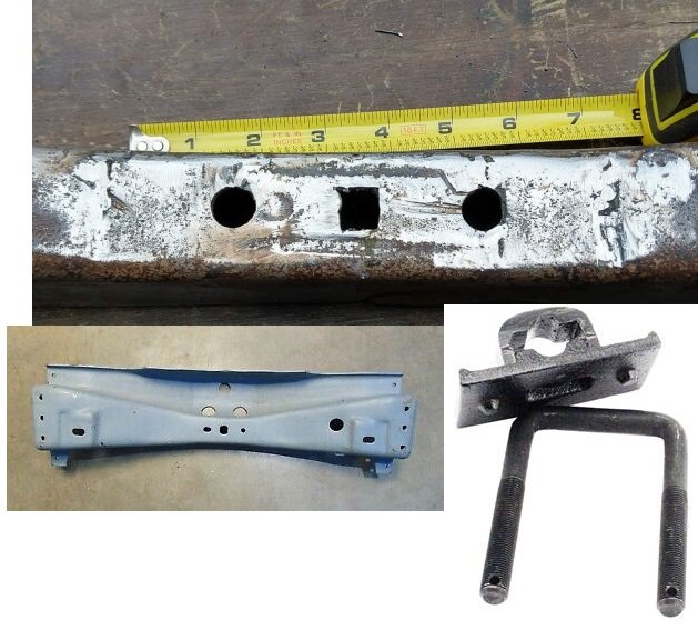 John, looking at your second picture you can see the remains of the "bump" to the left of the center hole. I see two choices for you: 1 install a new cross member; 2 fill those holes and weld on new bumps positioned to fit the outside ends of the spring clip recesses so the clip can't slip to either side.