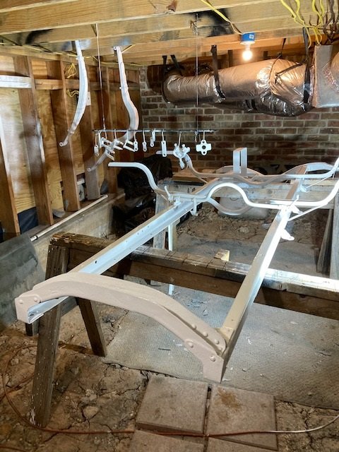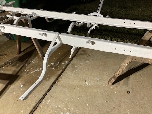 Well, here it is sort-of. Cleaned up after riveting, primed the remaining rivet burn spots and the first coat of tractor paint is brushed on. The good: it is the chassis so it won't be seen much and some parts not at all. Brushing on is historically accurate. Brushing doesn't get on the neighbors nice cars and can get into some tight spots. The bad: lots of brush marks, lots of runs, the grey primer shows through in places but it is the first coat. I think I will try to spray it on for the second coat. I wonder what the most efficient way to fix the runs and maybe sand it more smooth?