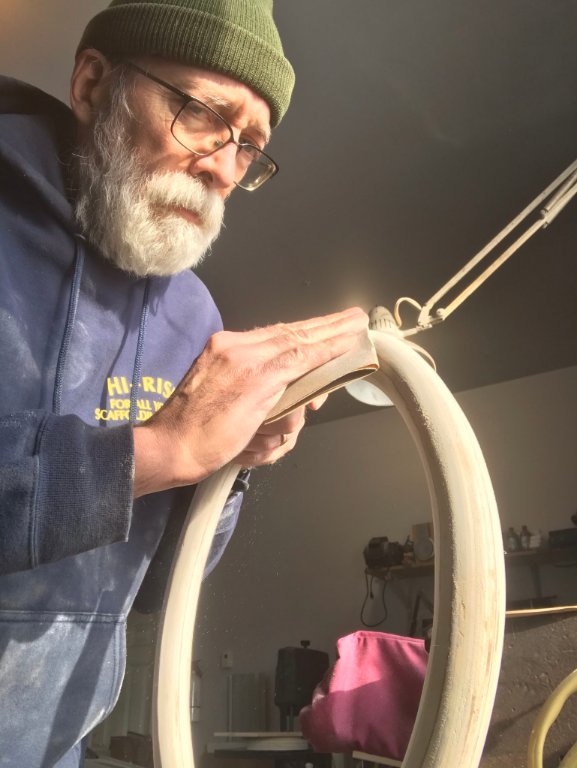 Made a steering wheel rim for my T. I have a 15" diameter wood rim wheel but the finger joints are in poor shape and have been badly repaired. I decided to make a 16" wheel (I had the spider already) so I glued some plywood together. I shaped it with a rasp and sandpaper and now I'm in the process of priming it and sanding it. I'm planning to paint it black when I'm done.