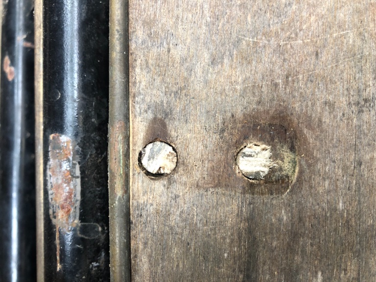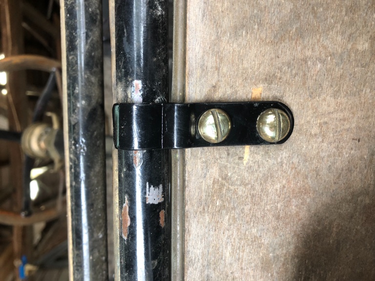 I replaced the reproduction brass windshield clamps Roth original ones. I’ve got the original bolts and nuts but I’ve got them with other items I need to have brass plated. I had to redrill the holes, I filled the other ones in Roth dowel rod. At some point I’ll need another dash when I get all the original hardware and then I can get all the holes just right.