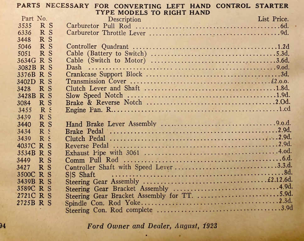 Found this chart in Ford Owner Dealer, from UK dealer on parts needed to convert left hand starter cars after 1923, to right hand drive.