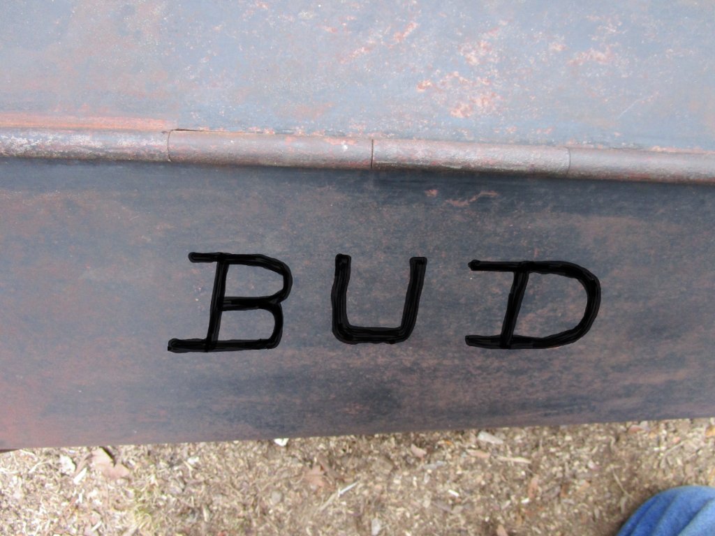 John, I have a very nice hood with proper patina for the car. Sometime in the distant past someone painted their names on the hood. The name "GENE" is on the driver side top panel, and the name "BUD" is on the passenger side top panel. There were also several "polka dots" placed around the names. The patina is a mixture of original paint and rust. It appears the names wore off years ago. Probably made with "shoe polish" But the names were there for long enough to protect the original paint allowing the names to show up as a "ghost" image in the original paint. It was hard to get a good picture of the names so I did a "paint" highlight of them to help show them. They add a neat detail to the car. I wish I could find out who they were.