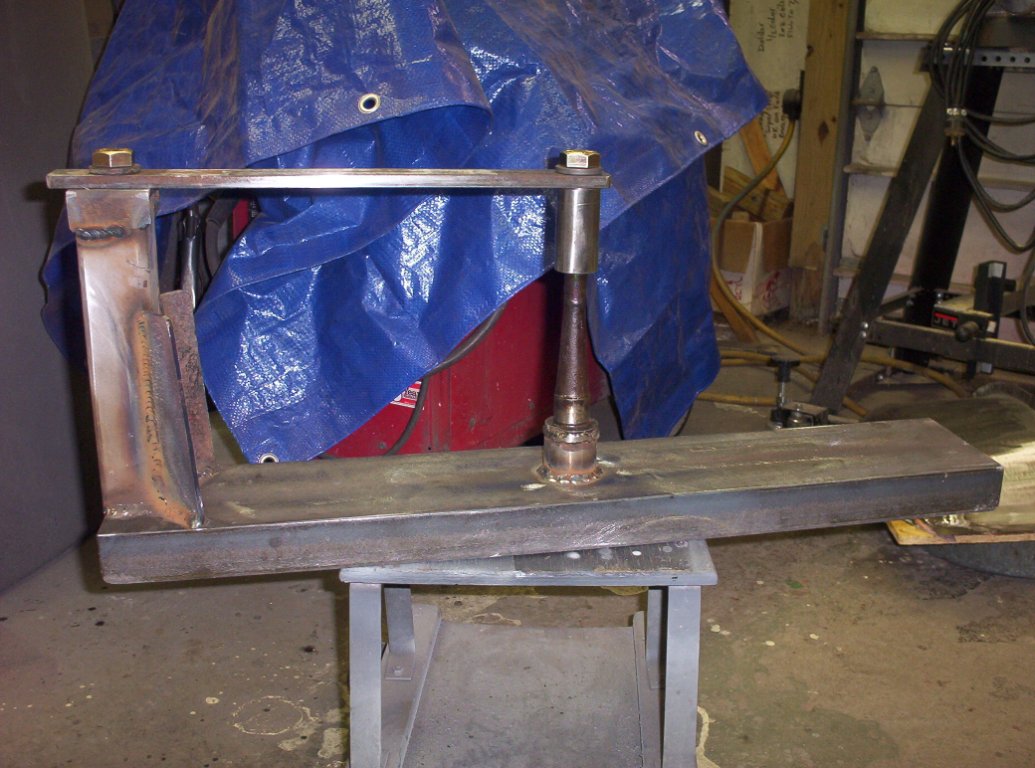 This is the trueing fixture I built I tried just welding a spindle to the channel iron, but about all that will allow you to do is to see the runout. If you need to use any force to remove runout, you will need some extra support. I chose to use an extra arm that screws onto the end of the spindle