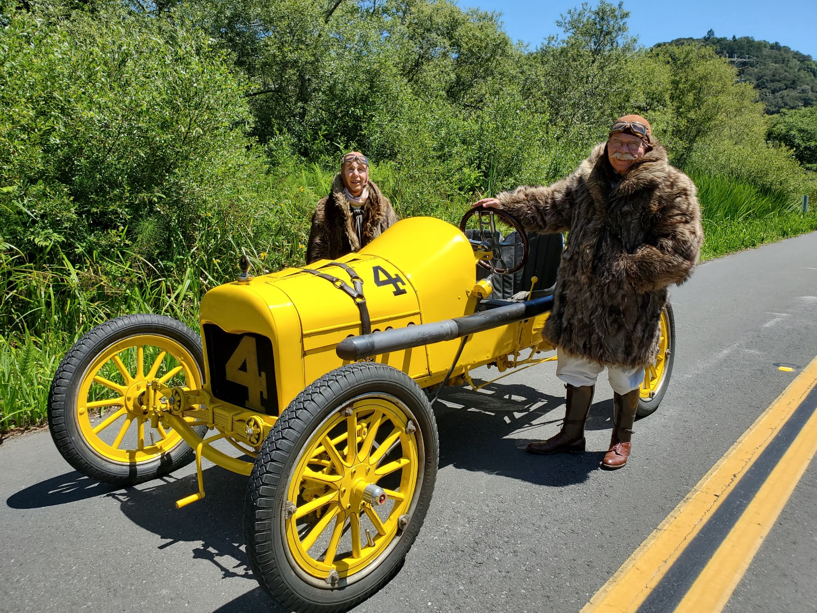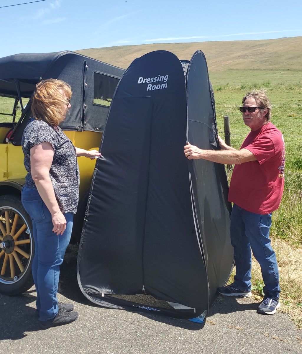 We are now in the California Wine Country. Perfect skies once again. Today, we left our Mill Valley hotel and twisted north through the majestic inland grasslands of Marin and Sonoma Counties. We were without cell service and gas stations for 85 miles. As you can see below, we are traveling with our own portable outhouse. Our picnic lunch today was catered by a hippie delicatessen in Fairfax Town. Upon our arrival in Healdsburg, we were welcomed by a German sausage restaurant for a satisfying meal of "worsts" on their moon-lit patio. This gathering was preceded by yet another parking lot cocktail hour among the Ts at John Padlo's "Rusty Water Bar" and followed by Lee Chase's (MTFCA Member #29) 91st birthday celebration complete with two carrot cakes. This was the the most engaging day of touring yet so far.