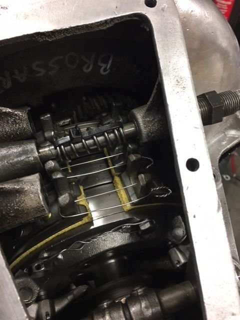 Steve, I use copper wire. It's non magnetic, should a bit come loose, and it is softer to to bend around when withdrawing it . On our RHD set-up we have two springs to contend with, reverse and brake. I do not like the new springs available because they seem to be longer than necessary and too strong. Unless there is damage to the springs, I leave them well alone. I do measure the gap and wire the band ears together to match the gap. This leaves the maximum clearance to get the cover over the springs. Obviously, others do it differently.