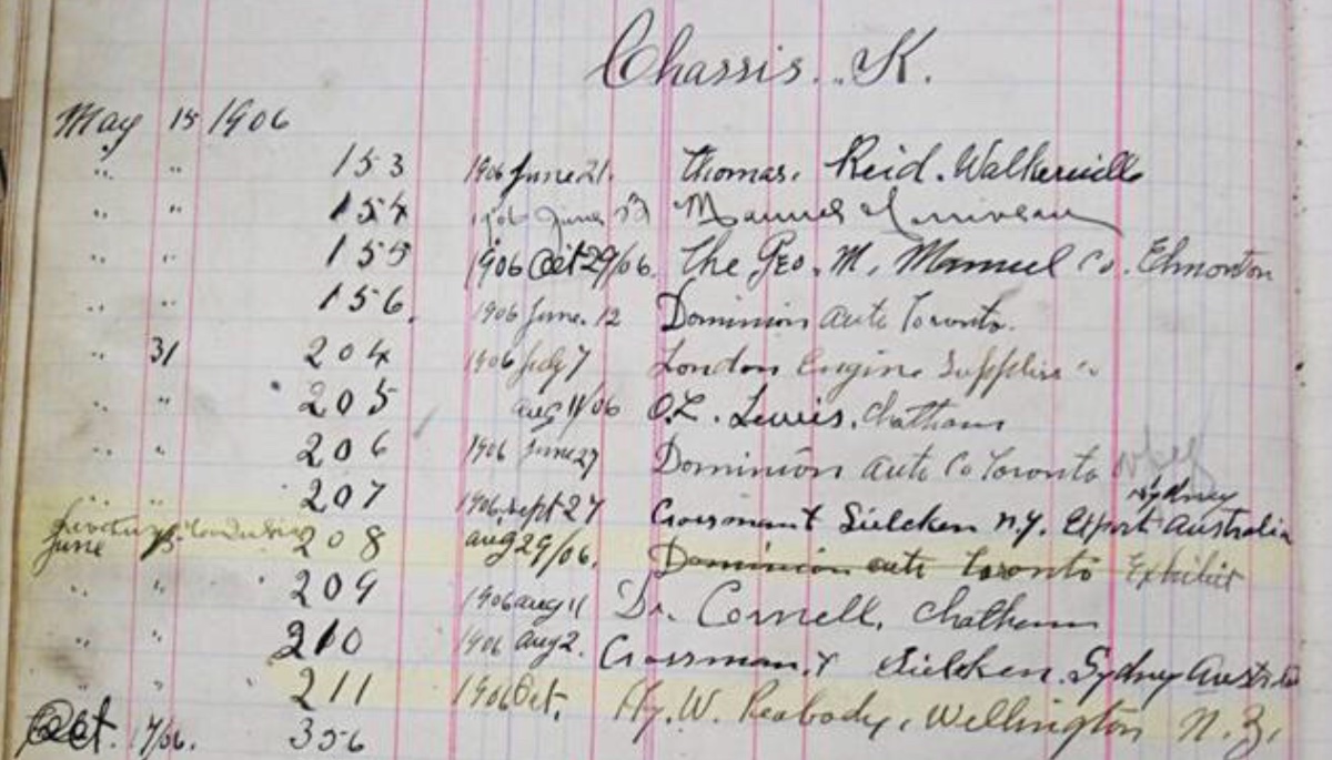 During the summer of 1906, Ford Motor Company sent a batch of Ford six (Model K) motors across the river to Ford of Canada. The ledger below from Ford Canada tells us the now completed Model K number #211 (bottom of photo) is shipped to New Zealand during October 1906. Model K #210 is shipped at the same time, to go on to Australia: