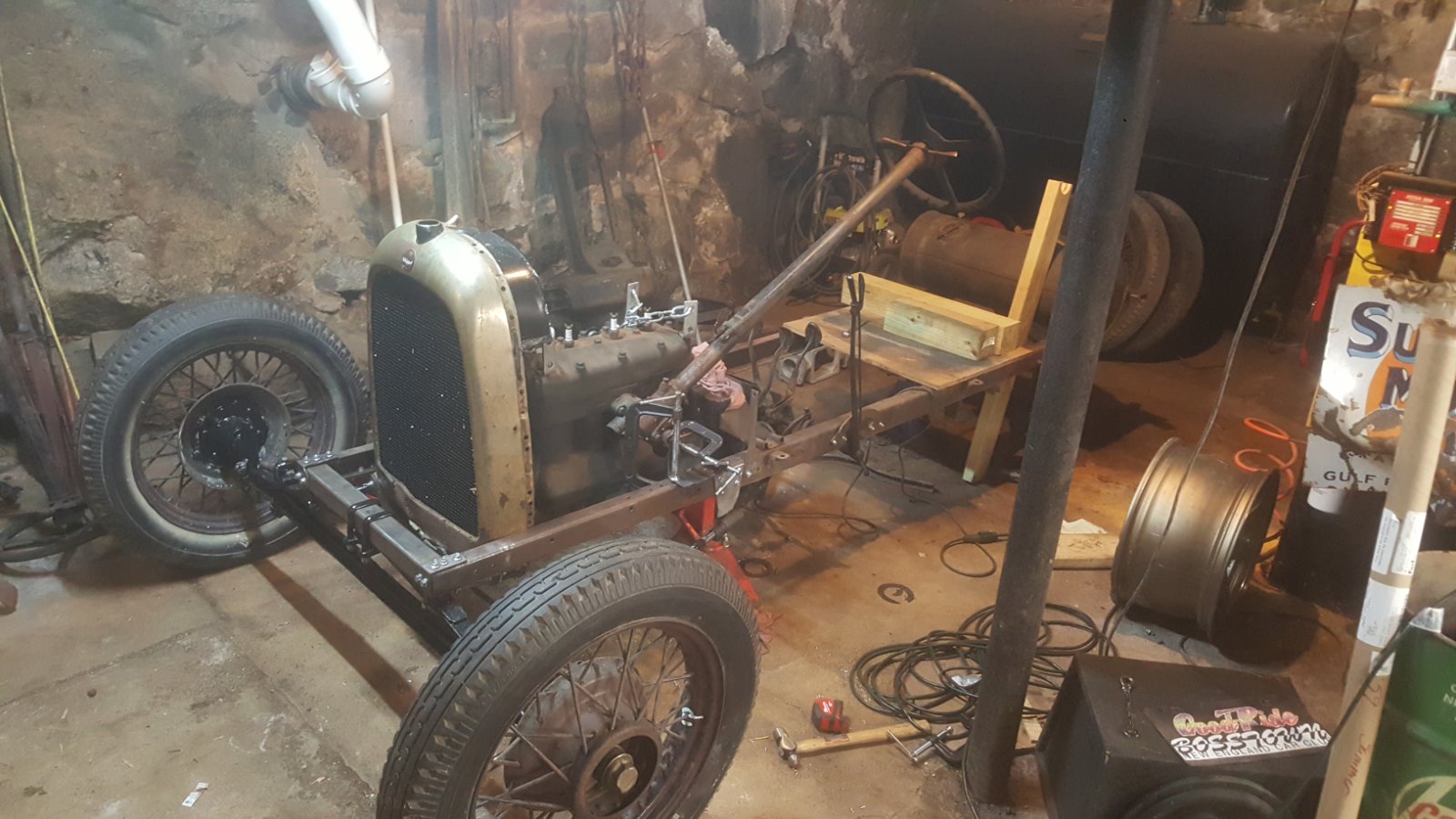 Modified T frame, Model A steering, a happy accident that it came up through the same hole in the firewall. My column will be shortened though. I am also using an A front axle complete, but used Model T spring and perches. Some mods will follow as I may add front brakes. I have the parts to do a '28 Chevy overhead on a T block.
