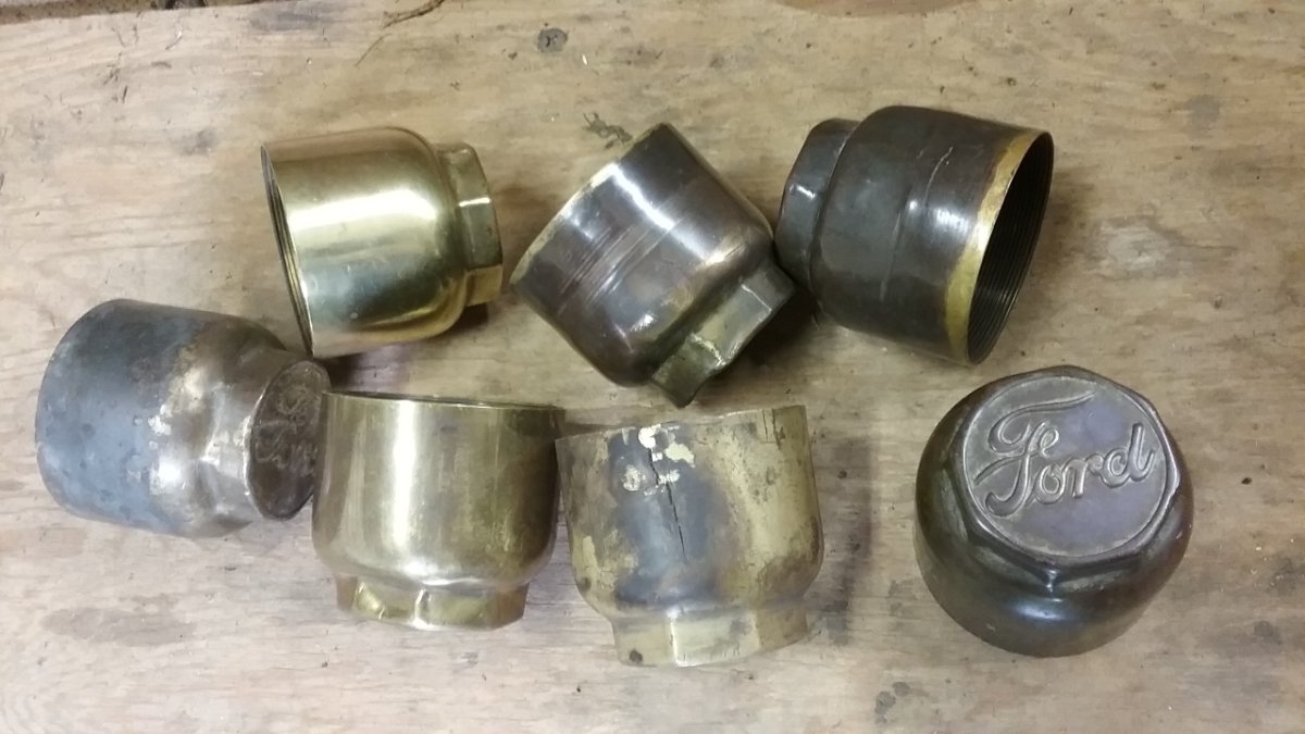 For my 1913 and 1915 two Ts, I welded several brass hubcaps myself. It is tricky, heat must be very carefully controlled. I cleaned up a rear hub with longer than some threads. Threaded the hubcaps on, and used modern worm-screw hose clamps to pull the splits together and almost tight. I used standard fluxed brazing rod, and welded the brass. Heat control was tricky, just a few degrees too hot and the brass hubcap melts away quickly! Part of the trick, is to reverse usual welding practice. Instead of the item being welded having a puddle and the rod just below melting temperature touching into the puddle to blend into it, get the end of the rod hotter, and let that raise the item's surface the last few degrees to blend together. Temperature control is critical! A few degrees too cool, and it won't blend. A few degrees too hot, and you get about a quarter inch hole before you can stop it! I did manage to fill in and re-flow the metal and save a couple that I got too hot. But that was really difficult, and the result was only fair looking.