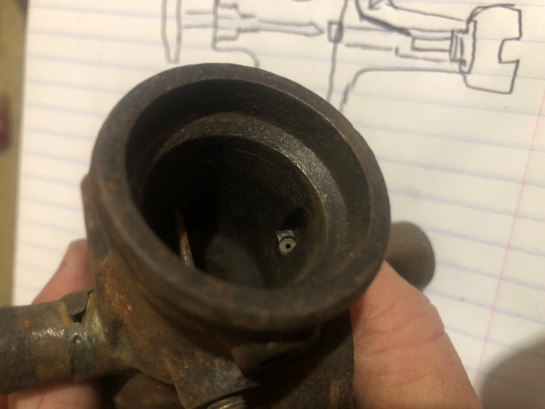 You can see on top of the carburetor to plugs, one is to plug the hole where they drilled this passage from the top and then sealed the top of this passage which is intersected by another. The other is where a stop for the flapper is inserted. The passage that intersects this one comes from the choke side of the carburetor.