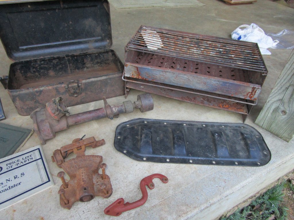 Here are the treasures I found at Chickasha. I did not buy much this year ... The sun visor has green glass (one missing) and fits to the windshield stanchions of a 23-25 one man top on touring or roadster. I have not tried it on a set of two man top stanchions yet. But it appears that it will also work on them. The two parts catalogs ar original, not reprints. The spark plug in the last photo just looked so sad in the condition it is in I just had to bring it home with me. It will be "put out to pasture" and join its other cousins in my collection. But I am going to try it out and see if it still works. " I bet it will still work".