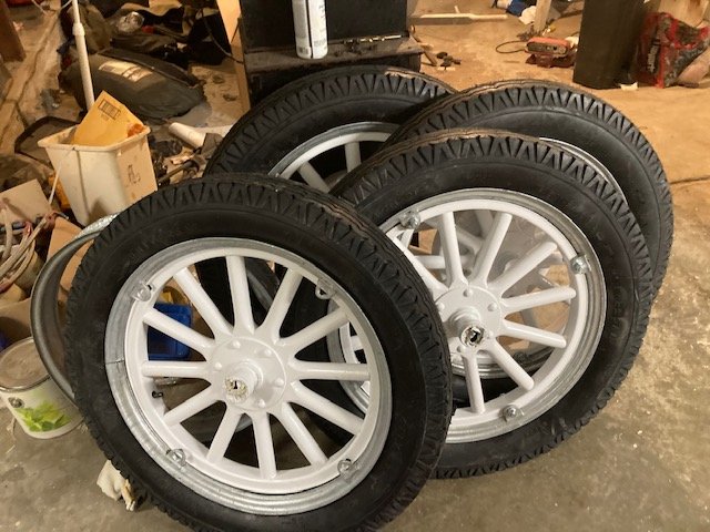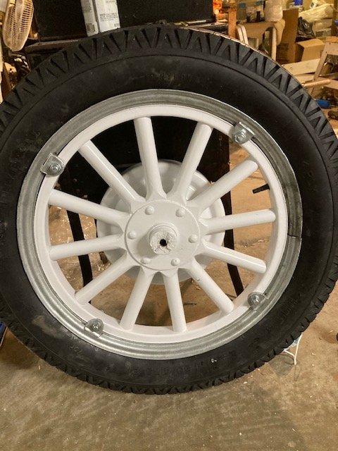 I have about 3 and a half wheels now. A working rim spreader arrived in the mail just in time Friday to replace my broken one. That was very fortunate. I changed to MAPP gas to heat and free the remaining galvanized locks. The first wheel was not straightened and is slightly kinked. The second one was the worst of the bunch. I straightened it as well as I could with an arbor press but it still isn't quite round but round enough for the wheel to go on. I am giving up on that one for now. The third wheel was and hopefully still is round but was hell on earth to get the rim sides to line up. The fourth and last wheel flap for some reason kept on coming out which resulted in a wrestling match. The last wheel in the foreground was a 'Bimel' and looks very much like a Model T wheel and is very close but not close enough in its dimensions to fit. The wheel holes are slightly too low for the bolts to fit. I may have to get another front wheel and paint it. So I had hoped to get this done this weekend and have a rolling chassis. Close, but no cigar.