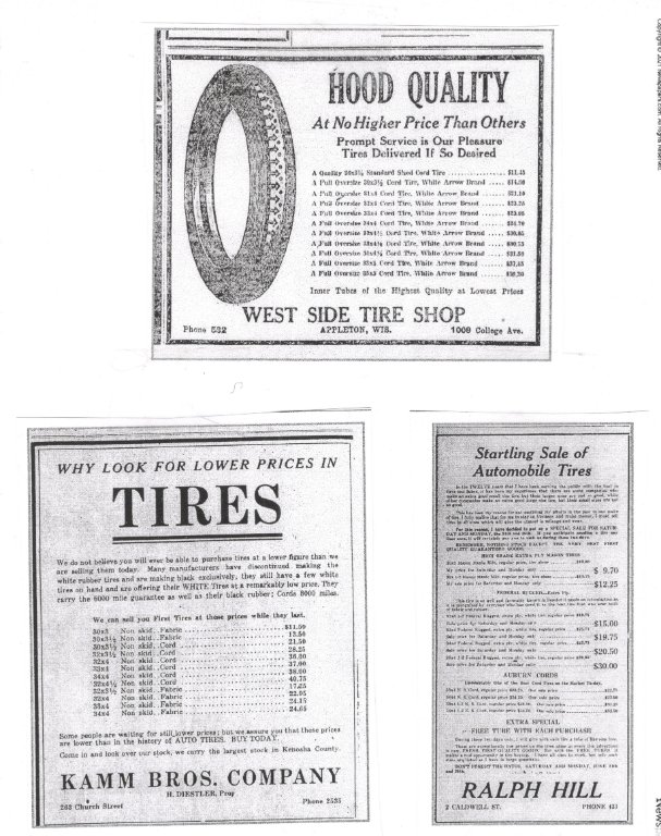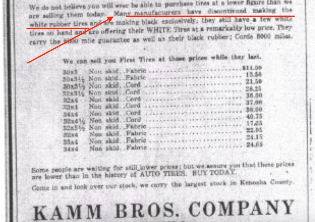 Thanks for posting those newspaper adv.dates. The dating does seem to confirm that 'all-white tires' were gone in 1921. As the date of that 'discontinued sale' adv. was 1921.