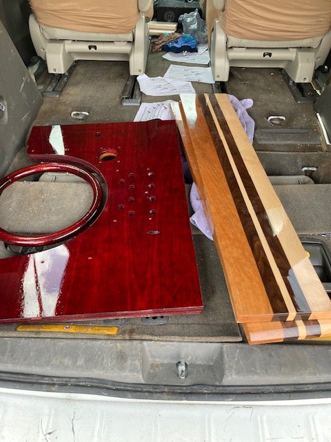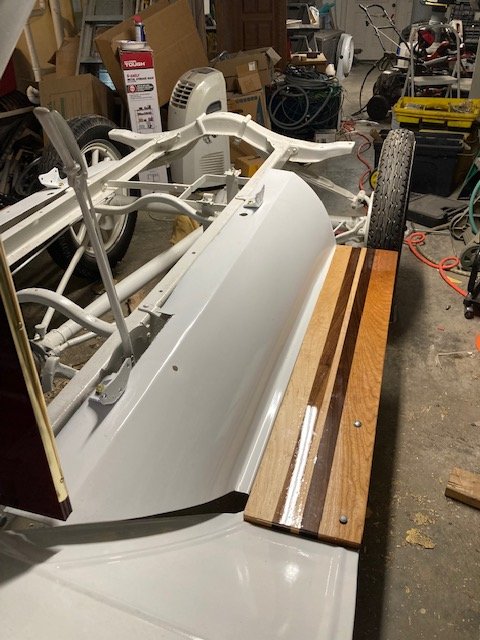 The coil box and coil boxes are in. Brass trim is on. Fitting the fenders and running board. The wood body comes back from the painter Wednesday.