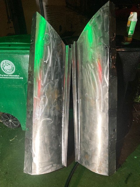 More progress. The skirts are welded, ground, stripped with Citri-strip then phosphoric acided and ready to paint. My amateur weld job should not show with the body on. The wire brush wheel on the grinder is very effective but flings steel hairs at me. Stripped paint goes everywhere too. I had to wash the other cars and garage door afterwards so that thrown bits of stripped paint don't strip the other cars and garage door. Some of them penetrate the skin on my legs like some weird acupuncture that I discover attached to me later and have to pull out.