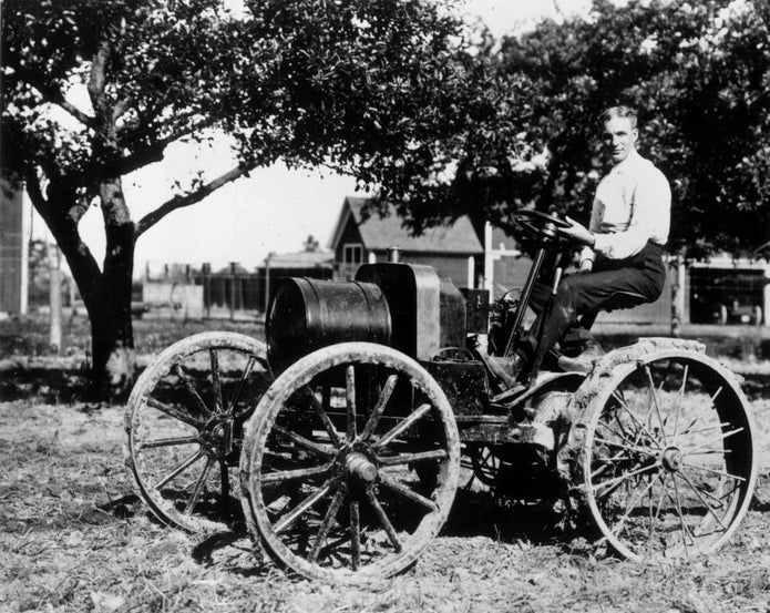 Henry driving an 'automobile plow' as he called it.