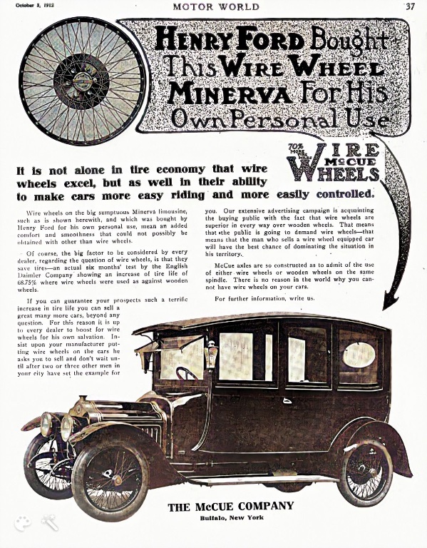 This 1912 article and wire wheel ad describe Henry Ford owning a large Minerva: