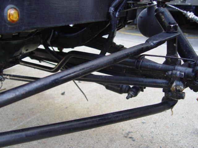 Here is a picture of one of the front disc brakes, and a picture of the split wishbone doubled up. If you have front disc brakes you definitely want to double up the wishbone to support the front axle. I recommend four wheel hydraulic disc brakes for anyone who drives over 45 in traffic. I always allow considerable stopping distance in any vehicle I drive, but the brakes on my speedster are good enough that I do not feel I have to allow any extra stopping distance beyond what I normally do.