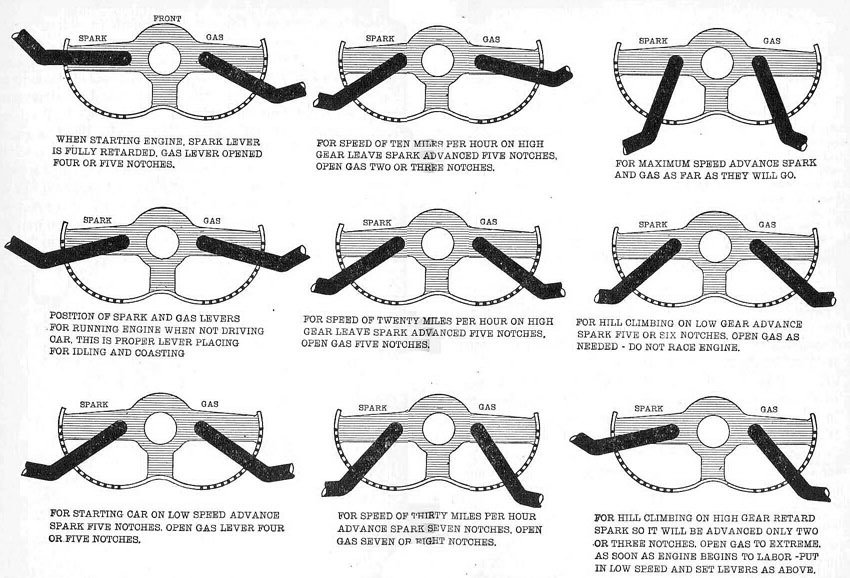 Here are the Ford recommended spark lever positions for easier starting on Magneto power only cars. I.E. no battery.