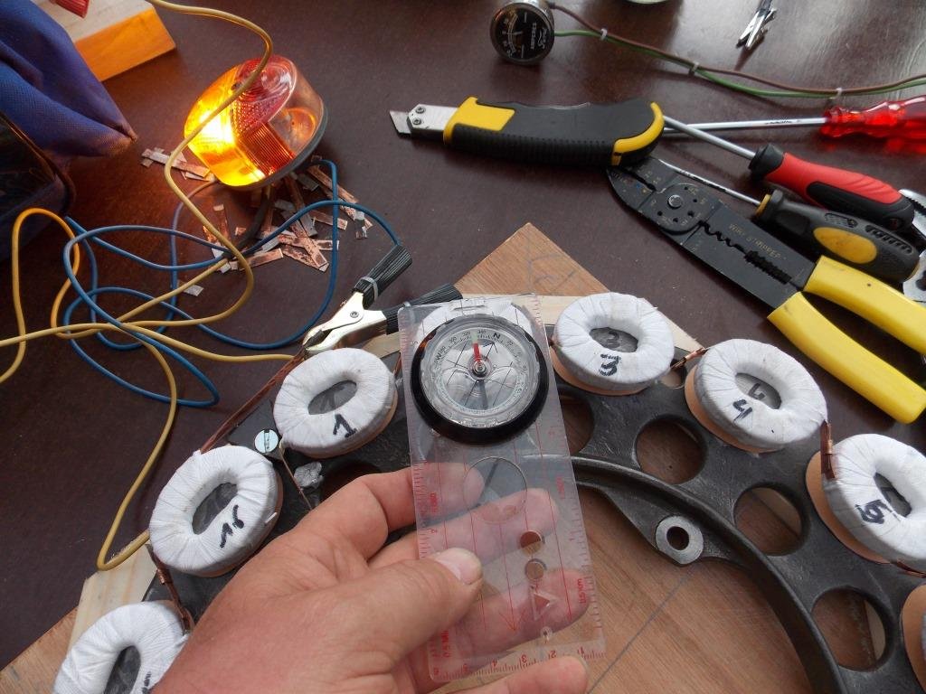 Preassemble your coil ring on the support and make a loop with a 12V battery, a 21W 12V light bulb and your coil ring. As the light lights up you have continiuty. With a compass, pass near to each coil and you should find North and South alternating. When, in front of a coil, the needle do not show N or S, this coil has a problem. With the double coils the problem could be an internal short or a mistake in the assemby of the coil.