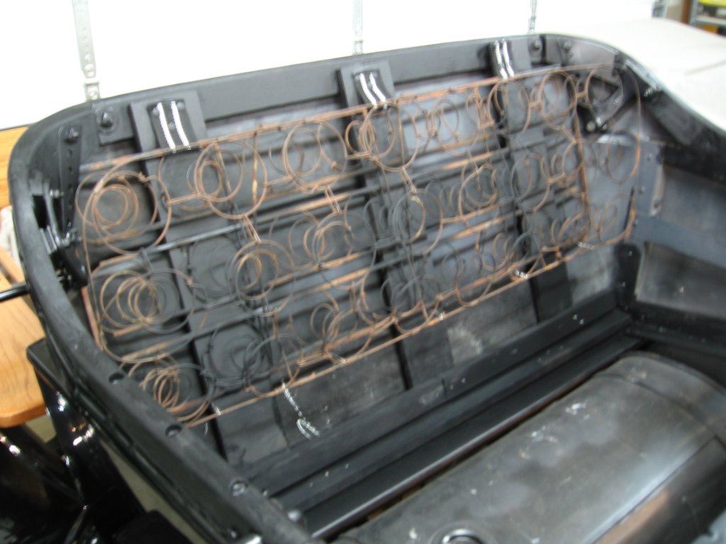 I found a set of one-man roadster irons and rear brackets online, then bought new top sockets and bows from Lang's. I bought the top kit from Classtique. The seat back upholstery hadn't been installed yet, so I had clear access to the inside of the tub.