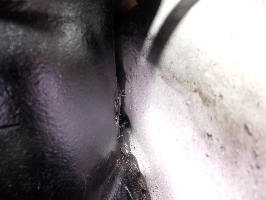 Andre, it is common for the early pans to crack there, the later years reinforced them, only way to fix it right is to remove pan and weld the cracks on inside and out then grind flat again for gasket to mate.