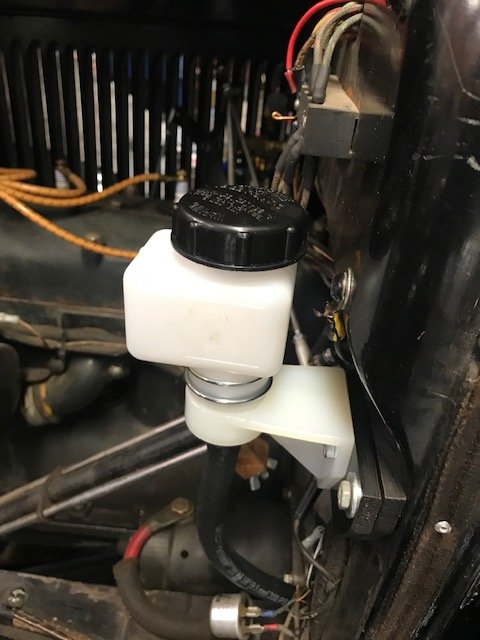 The 26-7 does present a challenge as to the placement of the reservoir. With my 27 Tudor the only logical place was under he hood on the firewall. The spot I wanted to use was, as others have noted, too close to the side and the hood. So I made an offset mounting from wood, painted black, which allowed me to mount on a smooth surface and shift the reservoir to the right. The hose provide reaches the master cylinder perfectly. See photos.