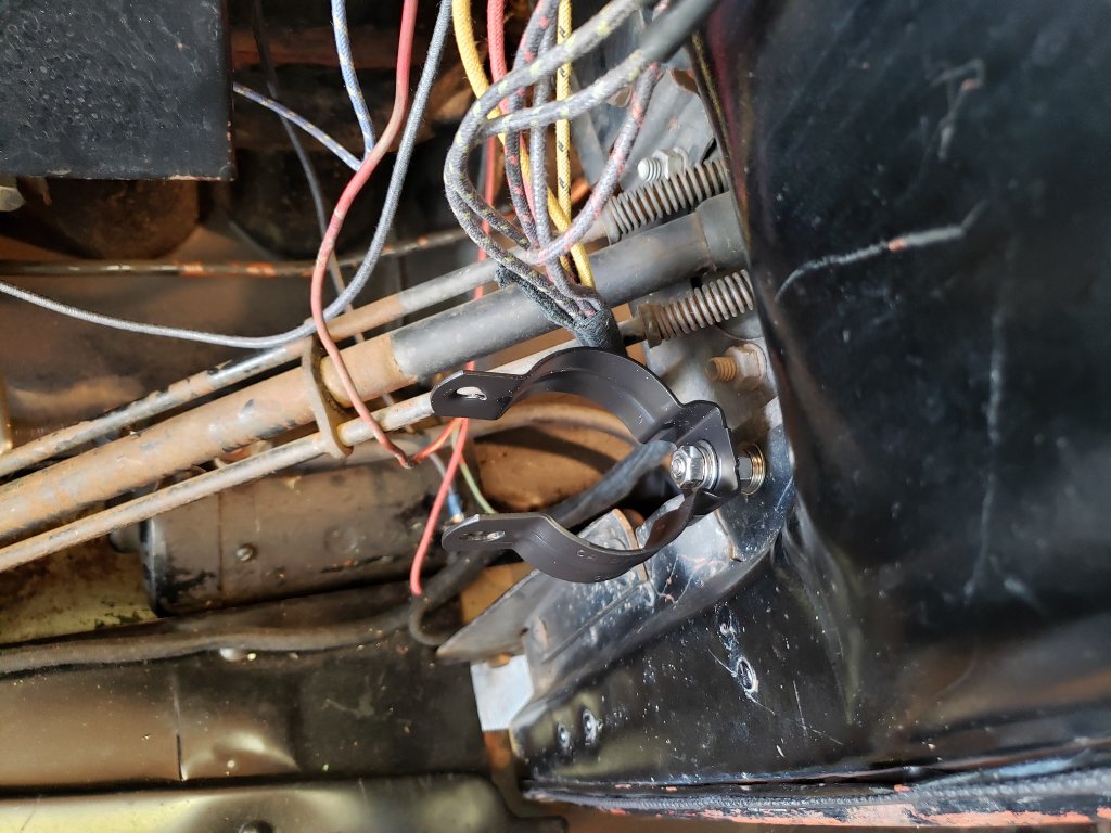To close the loop here. I didn't have to drill a hole. I replaced the steering column mounting bolt with a longer stainless one and stacked two nuts to space the bracket out for clearance on the firewall (see pics). Just need to check adjustment and bleed then done! According to the seller, the reservoir is a 1920s accessory commonly used on Chryslers. I don't know but it fits well under the hood and looks terrific!