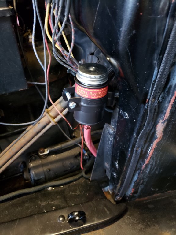 I didn't have any room on the engine side of my tiny '16 firewall, so I mounted the reservoir inside the cab on the firewall to the left of the coil box. The coil box mostly hides it, but it's still visible to check the fluid level without needing to open the hood.