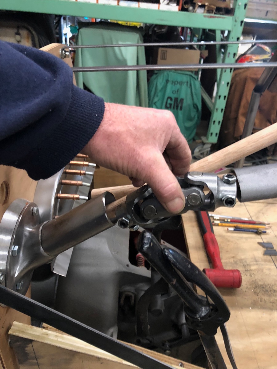 This column will have 19" from floor to center of steering wheel. Dave is using a flip up fat man wheel so this will work great! Since he will be using a high performance carburetor, we are converting the hand throttle into a choke lever and reversing the quadrant to the top for leg clearance.