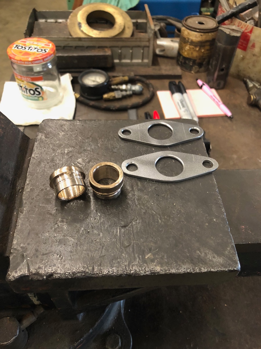 Now do not throw out those old triple gear bushings. They have a recycle fee in doing this as well as the brass rear cam bearing too. I drill out the supports from 1/8" plate making the center hole 7/8" and the two control rods 5/16". Those triple gear bushings work the best, then machine the ID to 3/4" slip fit on the shaft and a step from 1" to 7/8" OD. Look at the photos you will see a very light grove cut on the back side. I use this to tack weld a bead right on the brass edge. This method acts as a great retainer. You could use a external snap ring but I am keeping the bushing from spinning by the tack welds.